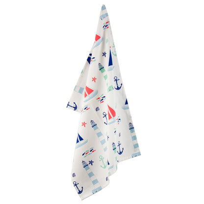 Whether you're a sailing enthusiast, a lover of coastal living, or simply appreciate the beauty of nautical aesthetics, this tea towel made from 100% cotton is a perfect accessory to add a nautical flair to your home. It also makes an excellent gift for friends or family members who share a passion for the sea or enjoy coastal-inspired decor. The towel showcases an assortment of intricate nautical illustrations, including sailboats, lighthouses, compasses, and seashells.
