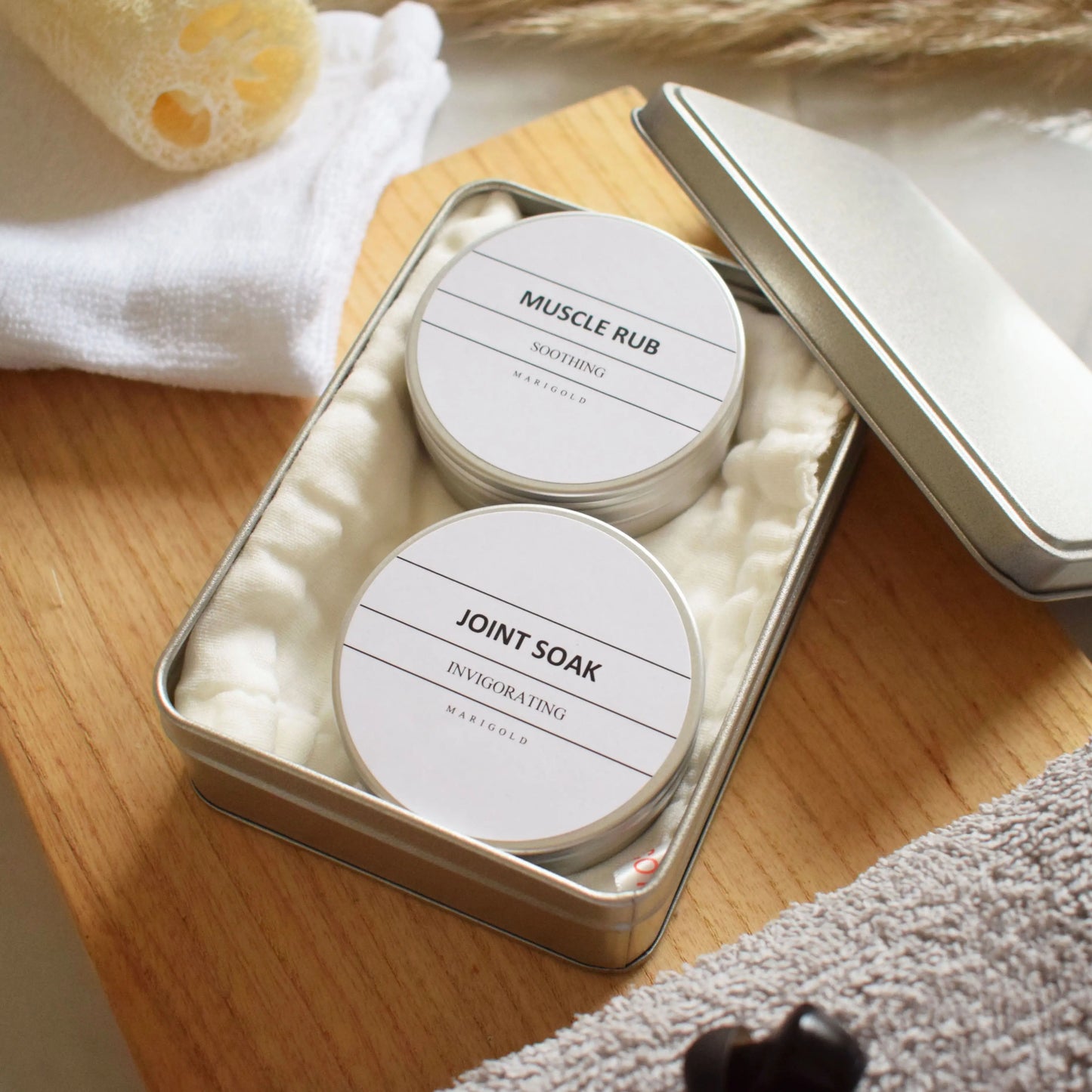 1x muscle rub, 1x joint soak, 1x organic muslin cloth |