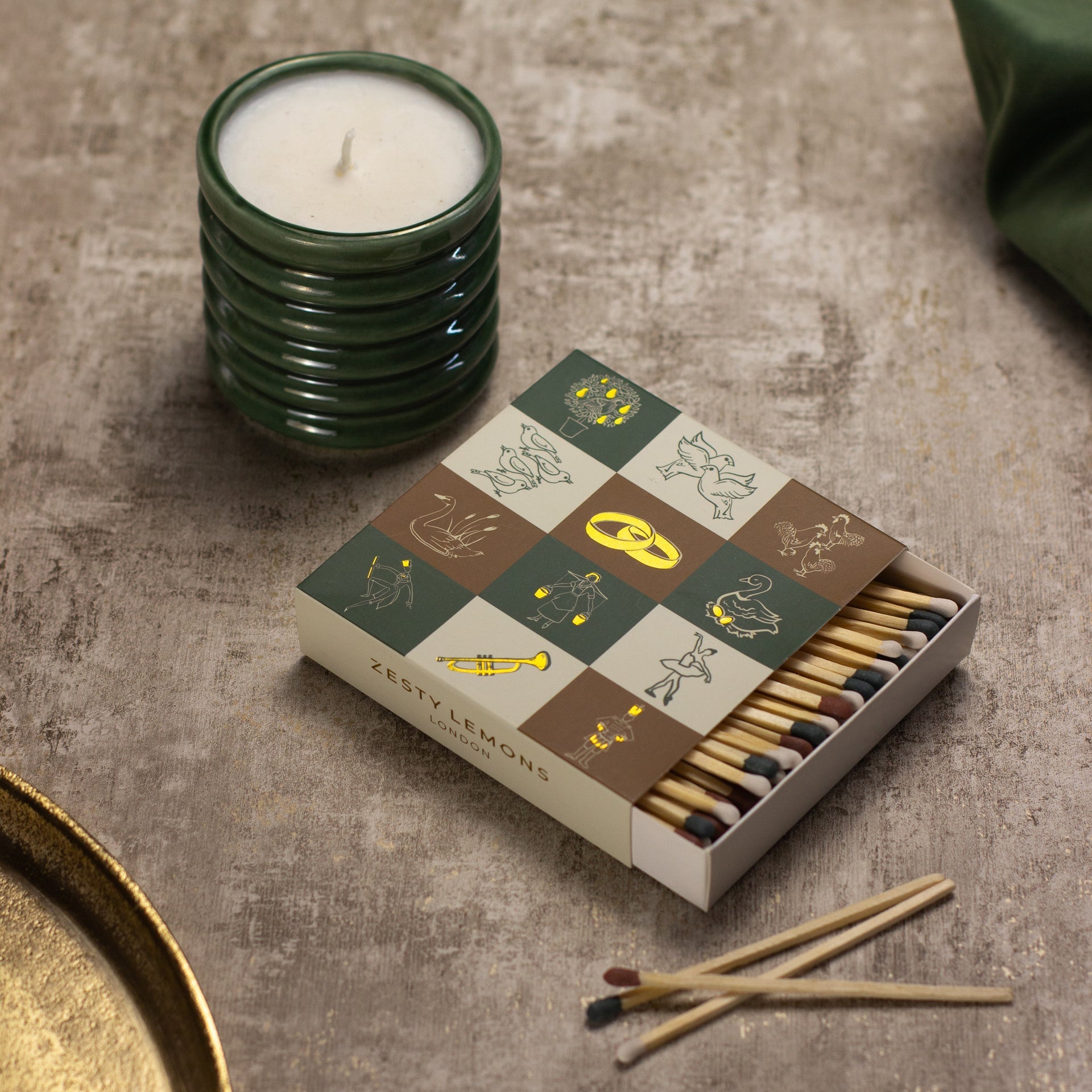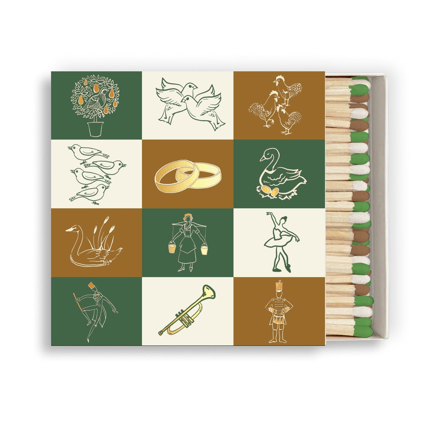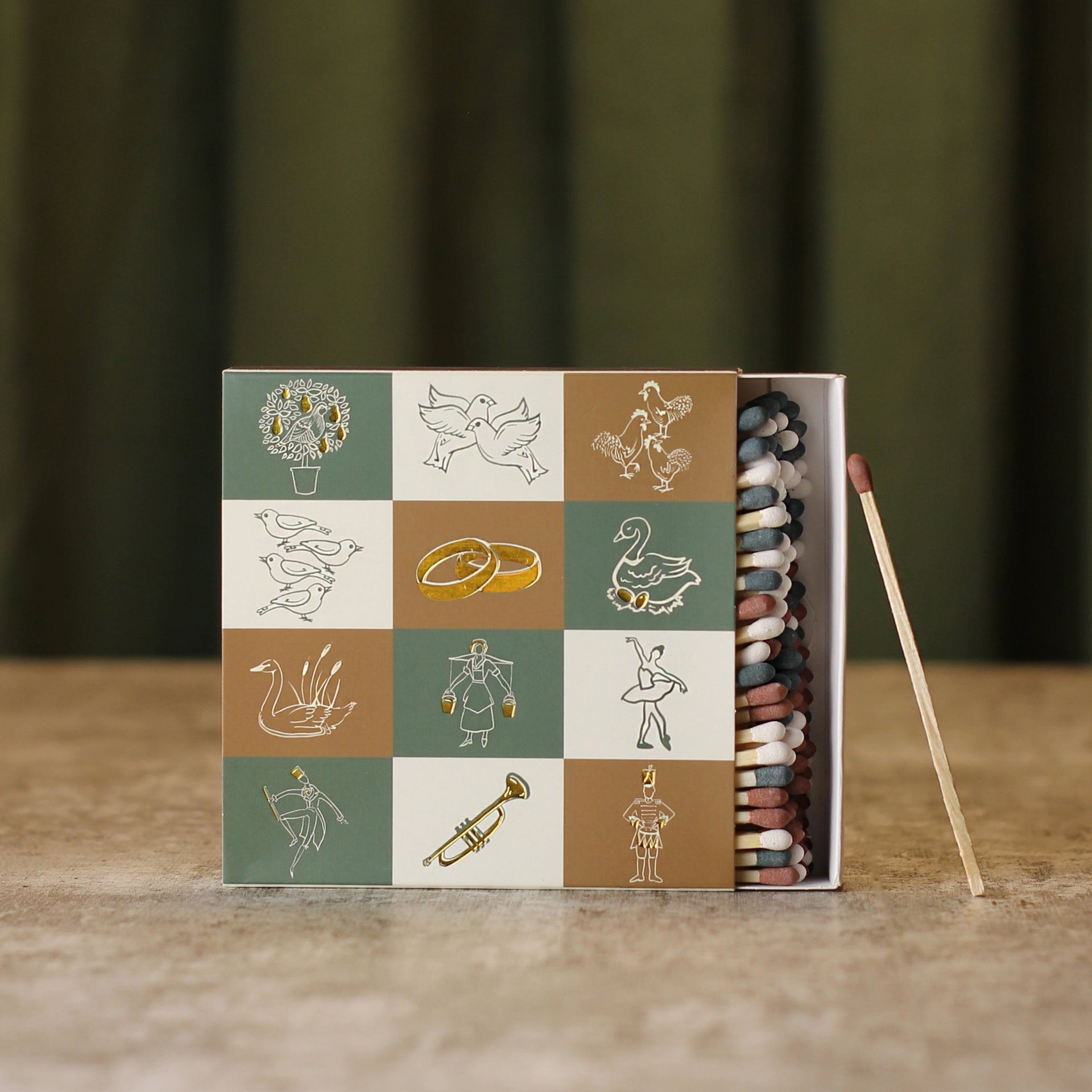 Elevate your festive décor with these premium safety matches housed in an exquisitely designed 12 Days of Christmas box. Adorned with gold foil accents and distinctive holiday artwork, this collection delivers 100 dependable matches that ignite smoothly and maintain a consistent, unwavering flame. The refined aesthetic makes them an elegant display piece for living rooms or dining areas, while their reliable performance ensures practical everyday use. An ideal standalone gift or sophisticated pairing with a coordinating Christmas candle, these matches seamlessly blend functionality with refined seasonal style.