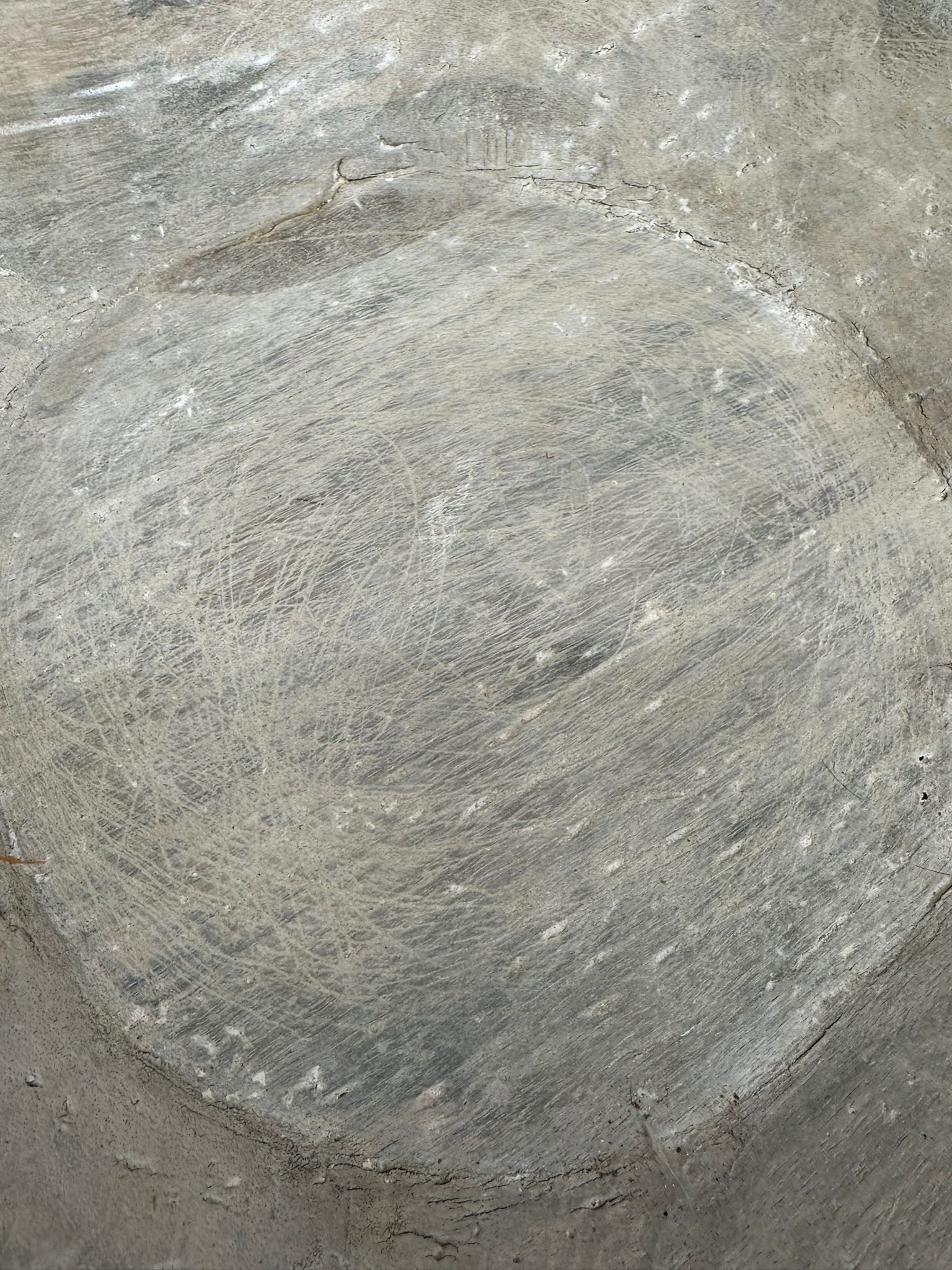 This substantial hand-carved wooden bowl, crafted from durable Indian hardwood, originates from traditional kitchens in North West India. It has been carefully bleached to reveal a soft, creamy patina that enhances its vintage charm. Each piece is unique, featuring distinctive etchings, scrapes, and marks that capture its rich history and character. Measuring approximately 40.5cm to 54.5cm in diameter and 8cm to 13.5cm in height, the bowl's size varies slightly, emphasising its handcrafted authenticity. Its versatile design makes it ideal as an elegant serving platter for fruit, bread, antipasti, cheese, or appetizers. While signs of age and use are present, they add to the bowl’s authentic vintage appeal and tell the story of its journey through time. This handmade piece combines practical functionality with decorative artistry, making it a beautiful centerpiece for any table or gathering.